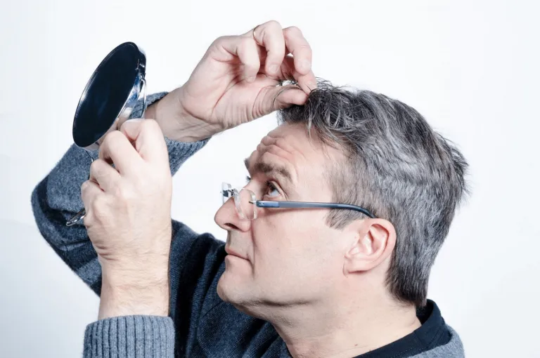 مردی میانسال که در آینه موهای سفیدش را نگاه می کند.