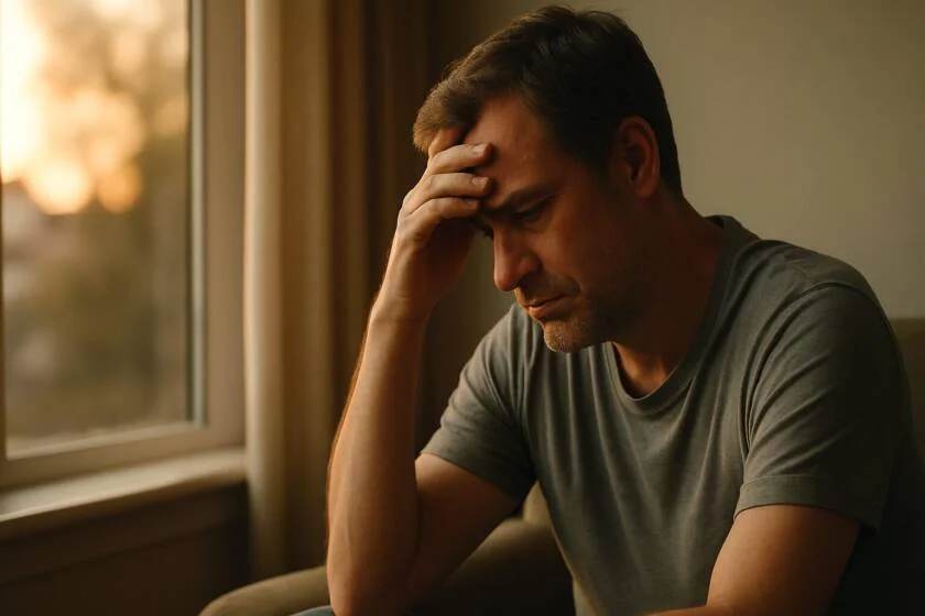 مردی در حال فکر و با قیافه ای مغبون؛ بحران میانسالی؛ ورود به دهه چهل زندگی.